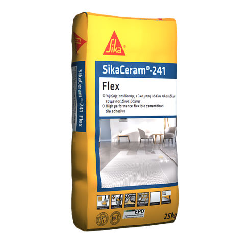 Η SikaCeram®-241 Flex είναι ενός συστατικού, υψηλής απόδοσης, τσιμεντοειδής λευκή κόλλα πλακιδίων, παραμορφώσιμη, μειωμένης ολίσθησης, εκτεταμένου διαθέσιμου χρόνου, με επιλεγμένα αδρανή, ειδικά πρόσμικτα και πολυμερή. Η SikaCeram®-241 Flex μπορεί να χρησιμοποιηθεί για συγκόλληση πλακιδίων σε πάχος στρώσης μέχρι 15mm, σε εξωτερικές και εσωτερικές εφαρμογές, σε οριζόντιες και κατακόρυφες επιφάνειες.