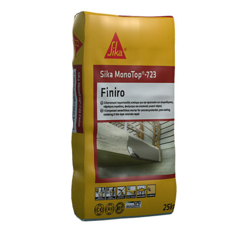 Το Sika MonoTop®-723 Finiro είναι 1-συστατικού, έτοιμο για χρήση, ινοπλισμένο, τροποποιημένο με πολυμερή, τσιμεντοειδές κονίαμα για προστασία, φινίρισμα και εξομάλυνση σκυροδέματος, σφράγιση πορώδους υποστρώματος, καθώς και επισκευές μικρού πάχους, εφαρμοζόμενο με το χέρι ή με ψεκασμό και πληροί τις απαιτήσεις του ΕΝ 1504-2, ως επίστρωση προστασίας σκυροδέματος και του ΕΝ 1504-3, ως επισκευαστικό κονίαμα τάξης R3.
