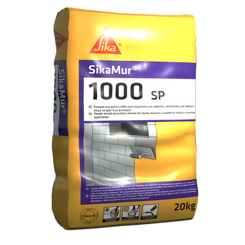 Το SikaMur®-1000 SP είναι ένα έτοιμο κονίαμα, ενός συστατικού, υψηλής διαπνοής, Τάξεως R σύμφωνα με ΕΝ 998-1. Περιέχει ειδικά ελαφροβαρή αδρανή, ασβέστη και τσιμέντο. Το SikaMur®-1000 SP είναι κατάλληλο για αποκατάσταση τοιχοποιιών με ανοδική υγρασία, βελτιώνοντας επιπλέον τη θερμική τους απόδοση. Το SikaMur®-1000 SP είναι κατάλληλο για εφαρμογή τόσο με το χέρι όσο και με μηχανικά μέσα.