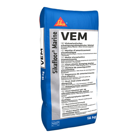 Το Sikafloor® Marine VEM είναι ενός συστατικού, ηχοαπορροφητικό, μερικώς αυτοεπιπεδούμενο κονίαμα βάσεως τσιμέντου τροποποιημένο με πολυμερή. Είναι ειδικά σχεδιασμένο για χρήση συνδυαστικά με τα κονιάματα Sikafloor® Marine-18, -118 FC ή -190 για μείωση του θορύβου ταλάντωσης χαμηλής συχνότητας. Το Sikafloor® Marine VEM είναι ελεγμένο κατά FTP και εγκεκριμένο σύμφωνα με τις Οδηγίες της IMO (Marine Equipment Directives).