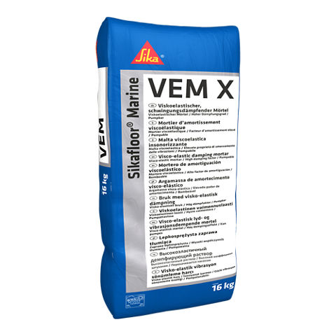 Το Sikafloor® Marine VEM X είναι ενός συστατικού, ελαφροβαρές, βισκοελαστικό κονίαμα, με ρυθμιζόμενη συνεκτικότητα ανάλογα με τις απαιτήσεις της εφαρμογής. Είναι ειδικά σχεδιασμένο για χρήση συνδυαστικά με ηλεκτρογαλβανισμένες, χαλύβδινες πλάκες, για μείωση του κτυπογενούς θορύβου χαμηλής συχνότητας. Το Sikafloor® Marine VEM X είναι ελεγμένο κατά FTP και εγκεκριμένο σύμφωνα με τις Οδηγίες της IMO (Marine Equipment Directives).